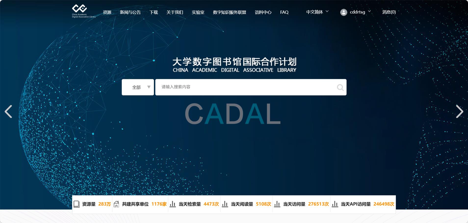 “大学数字图书馆国际合作计划" (China Academic Digital Associative Library,CADAL)由国家投资建设,作为教育部“211”重点工程,由浙江大学联合国内外的高等院校、科研机构共同承担,项目负责人为浙江大学潘云鹤院士。