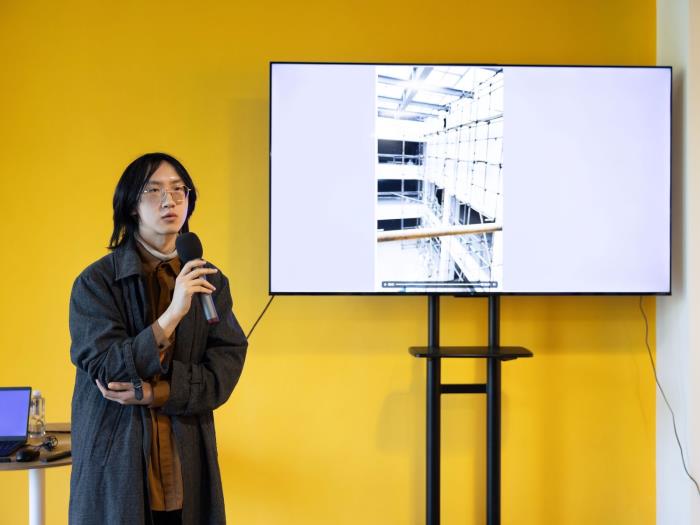 谭小军老师和杨小沛老师从图稿设计的不断演进讲到颜料选择及绘制技法的创新,从与内装施工同期开始绘画的干扰谈到高空作业的安全管理。杨老师讲到《探索》这幅壁画是有记忆的。一层层的颜料中混合有内装不同阶段的粉尘,他经历了图书馆内装施工的整个过程,也伴随着内装完工成就了自我。