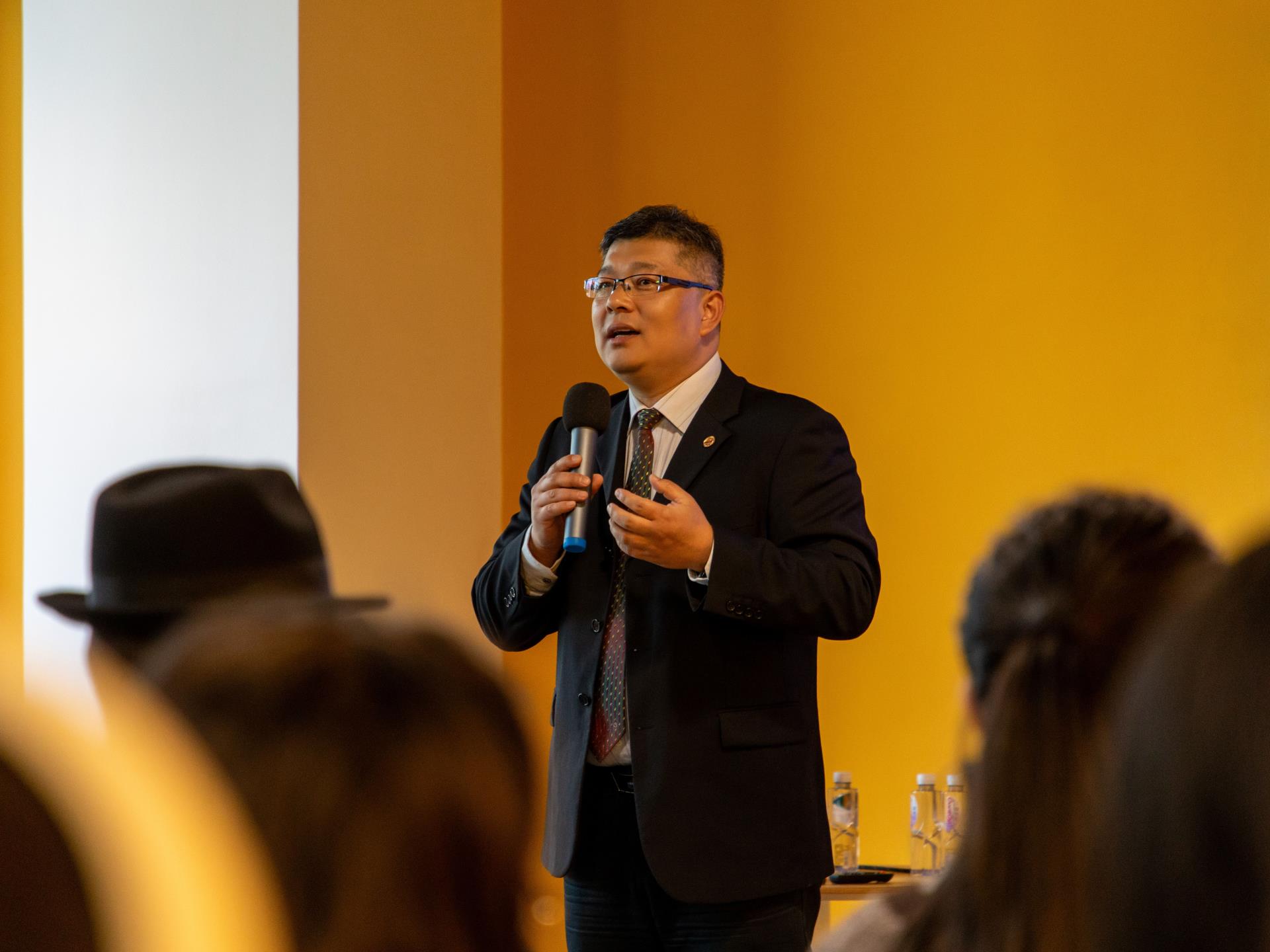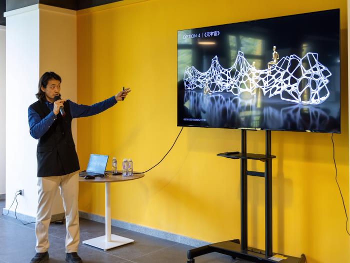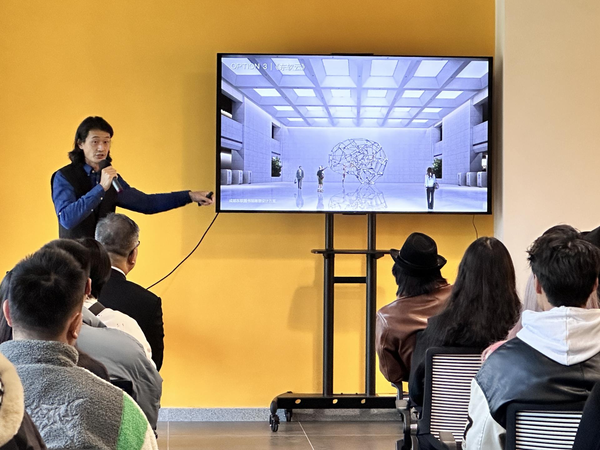 宋书魁老师首先上台,他分享了《超越》的灵感来源和刘老师对创作的指导,从设计稿每次的创新创意讲到计算机辅助设计,从锻造制作的过程谈到大尺寸、大重量雕塑的运输安装。他强调公共艺术品的设计,只要有可能引起观众不良的解读,就应该坚决放弃。