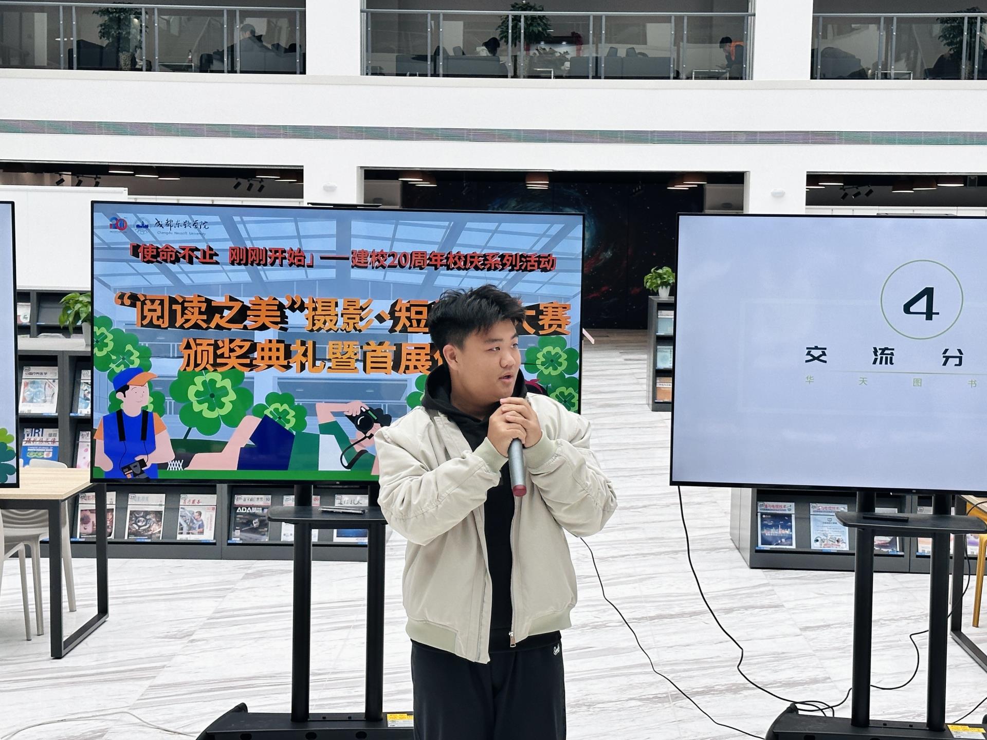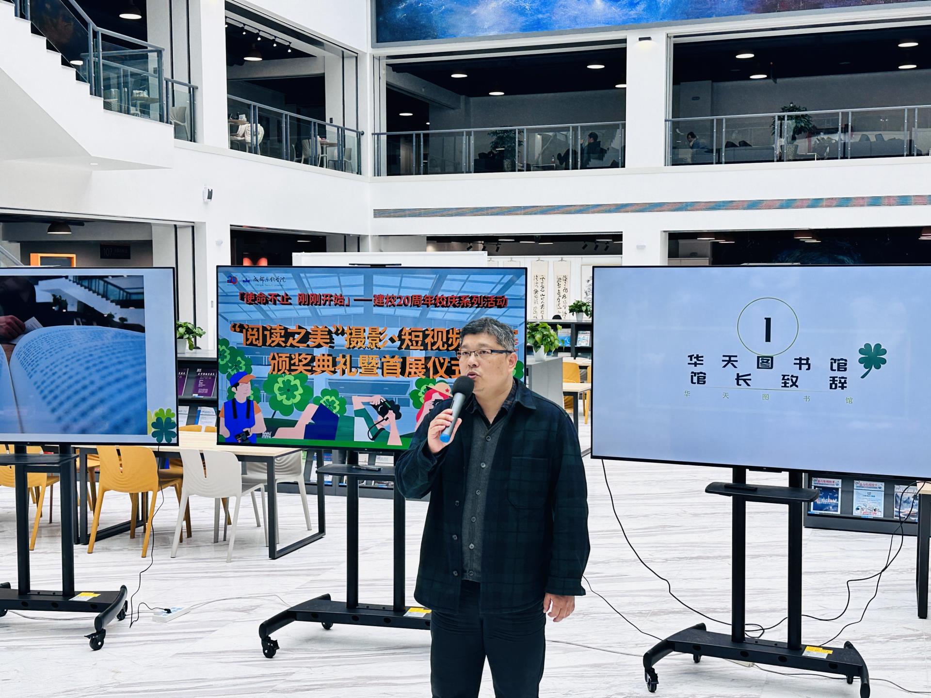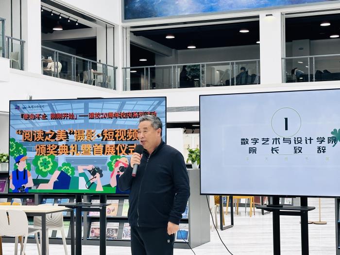 数艺学院李成家院长致辞。本次大赛既展现了华天图书馆的美丽与活力,又激发了师生们对摄影、短视频的兴趣与热爱,彰显了师生们的创作才华和艺术潜能。