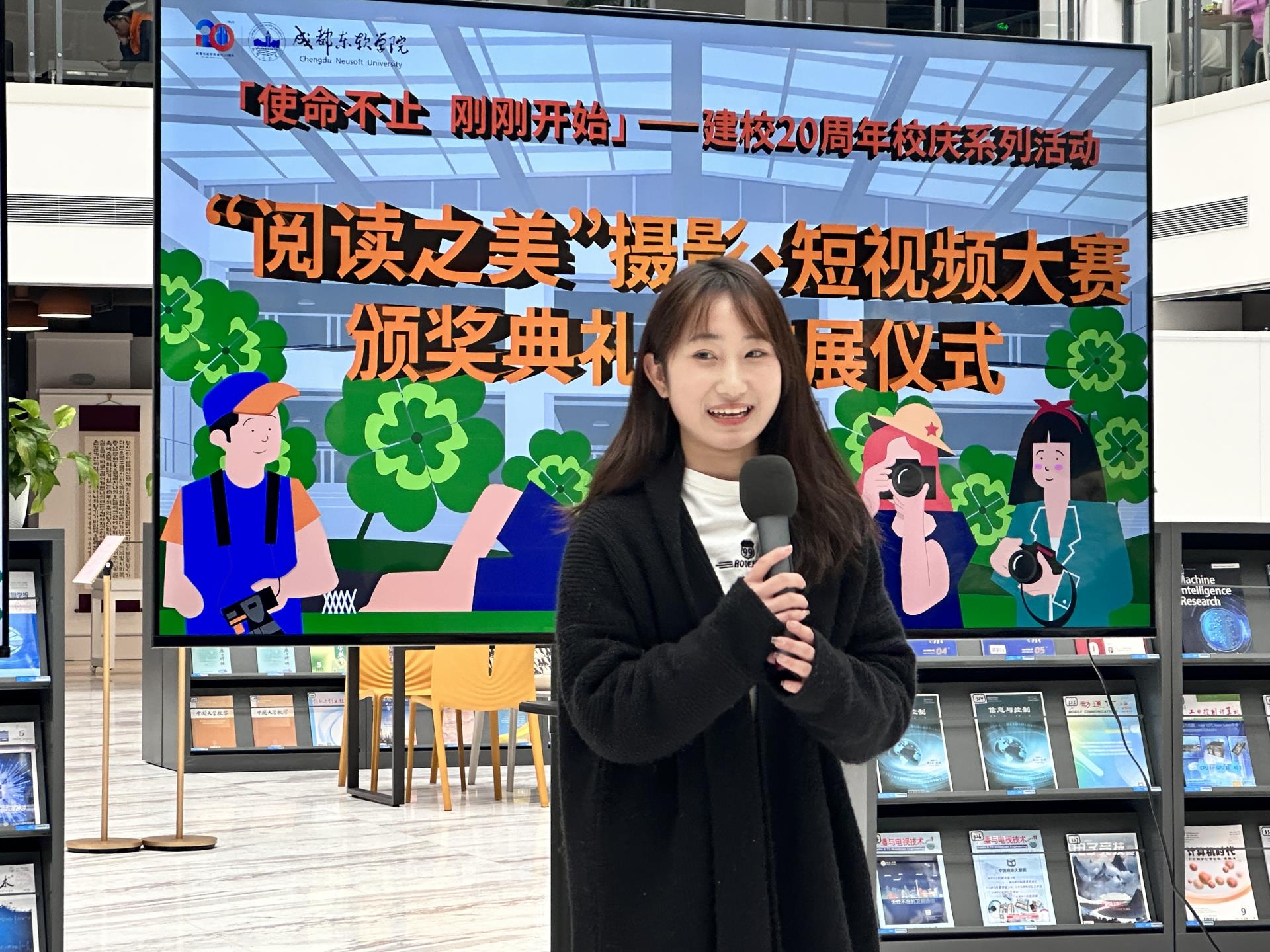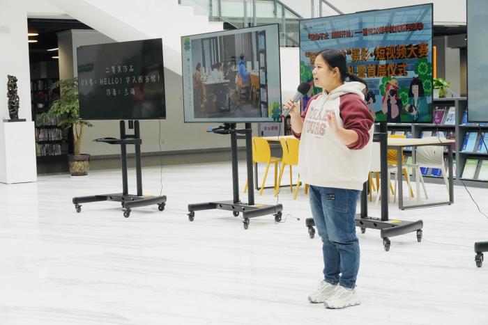 数艺学院李林芳老师代表大赛评委会讲话。图书馆举办这样的活动,不仅让学生将所学知识运用到实际,又加强了师生间的联系、丰富了师生们的校园文化生活。