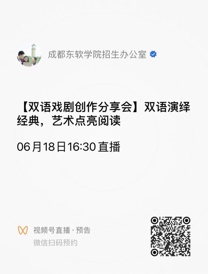 2.线上观看:我们将同步进行多平台直播,让你足不出户也能参与这场艺术盛宴!(直播平台:“成都东软学院图书馆”视频号、“成都东软学院招生办公室”视频号、“东软时光”抖音号。