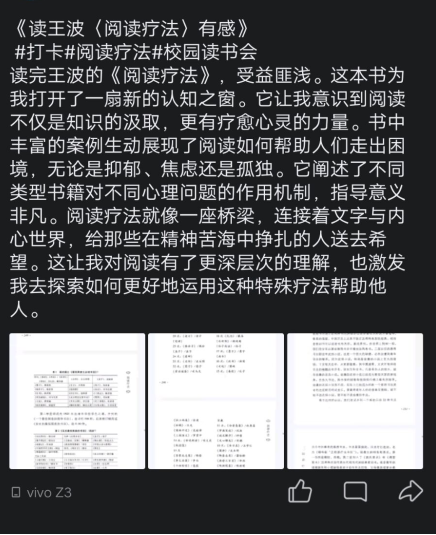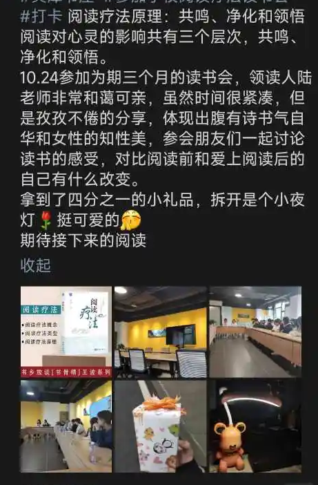 线上打卡:读者分享至少21天阅读情况到社交媒体平台,并带上话题#灵犀书屋或#阅读疗法读书会