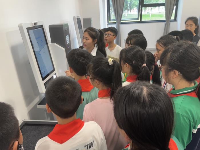 同学们还参观了自助服务区、阶梯阅读区、党建阅读区等功能区域。讲解员还为大家现场演示了馆内的座位预约、自助借还等功能。