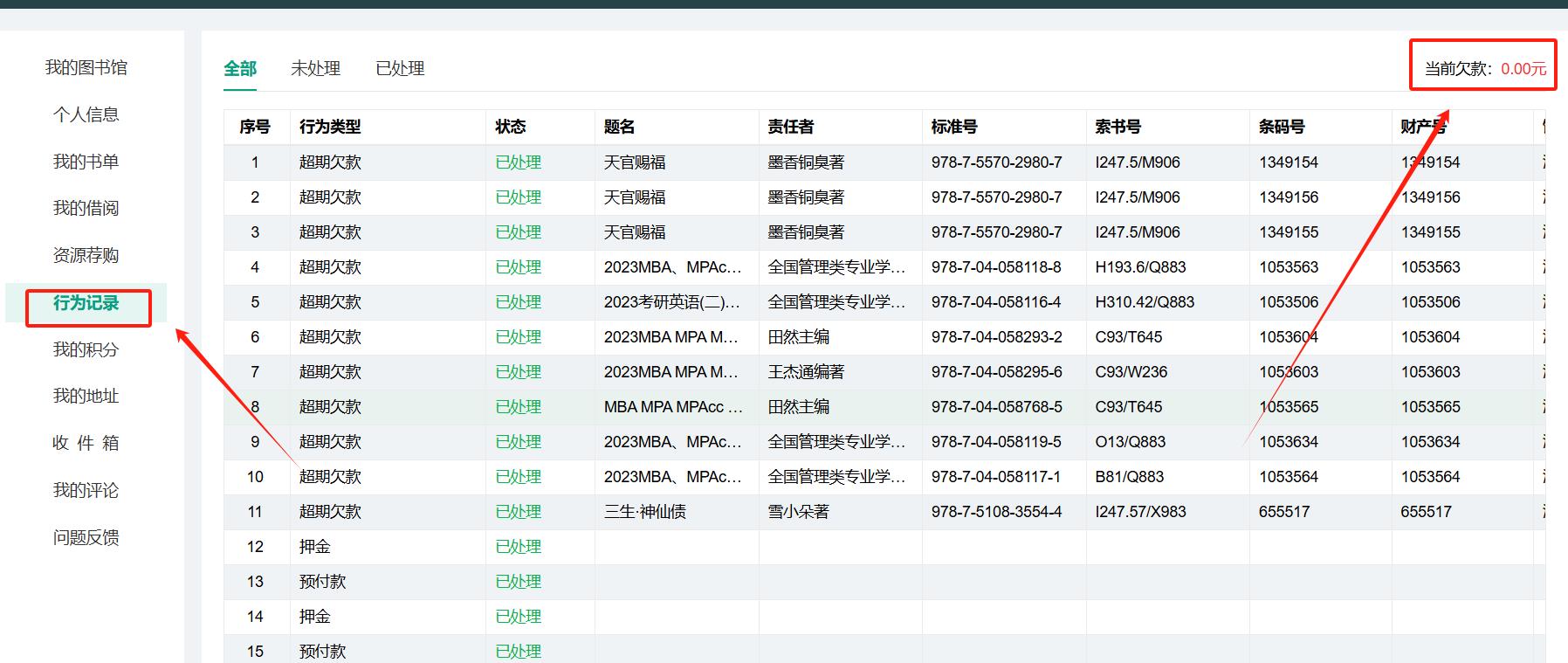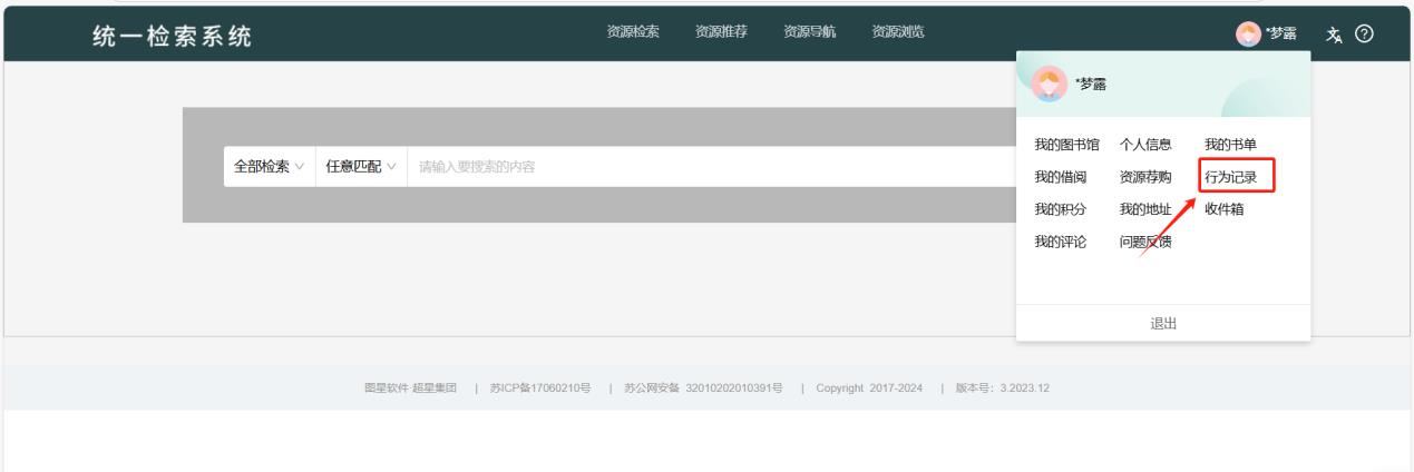 (2)查询欠费:点击右上角“个人名字”-点击“行为记录”-查看本人欠费。