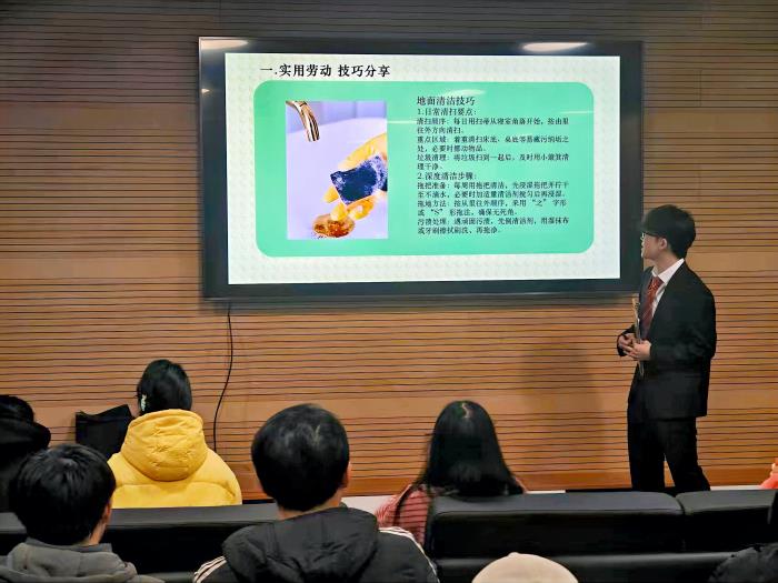 活动由图书馆学生助理团队的李朝阳同学主持。李朝阳同学指出,劳动不仅仅是满足生活基本需求的手段,更是青年在青春岁月中磨砺意志、雕琢品格、提升综合素养的重要基石。他通过分享衣物收纳、地面清洁等日常生活中的实用劳动技巧,以及劳动多样性在校园环境与未来职场中的重要意义,让同学们深刻领悟到劳动在生活层面的实用性以及在个人成长、社会发展维度的深远价值。