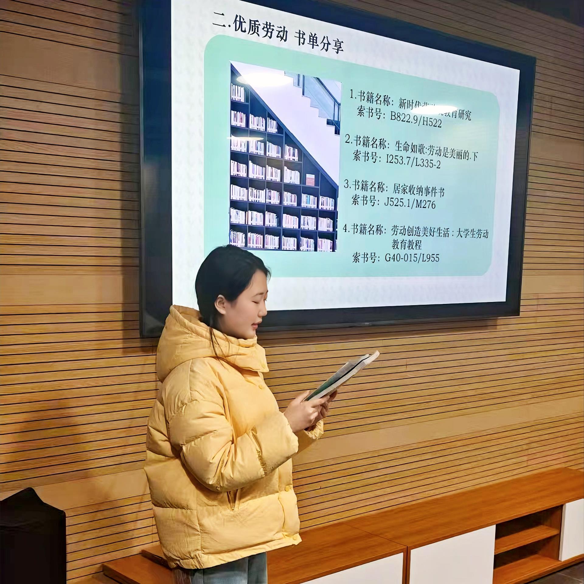 为了进一步深化同学们对劳动的认知,图书馆学生助理团队的李怡瑶同学为大家推荐了一系列与劳动主题紧密相关的书籍,包括《新时代劳动观教育研究》《居家收纳事件书》《生命如歌:劳动是美丽的》等。她鼓励同学们通过阅读,从理论的高度深化对劳动价值的理解,探寻劳动的多元意义。