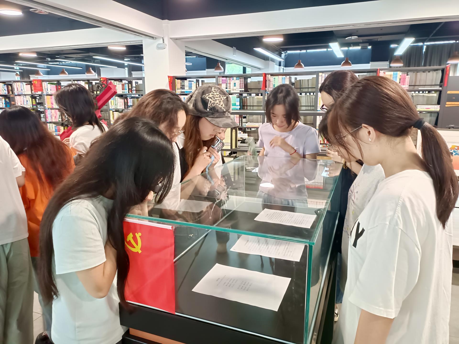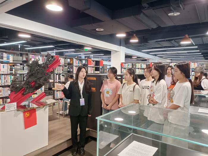 活动尾声,同学们移步图书馆党建阅读区,在参观中了解了《向前!向前!向前!》雕塑的创作背景。作品以革命历史为脉络,通过红色符号与人物群像,展现了先烈们无畏奋斗的精神,与非遗匠人的坚守形成跨越时空的呼应,深化了同学们对“传承”与“使命”的理解。