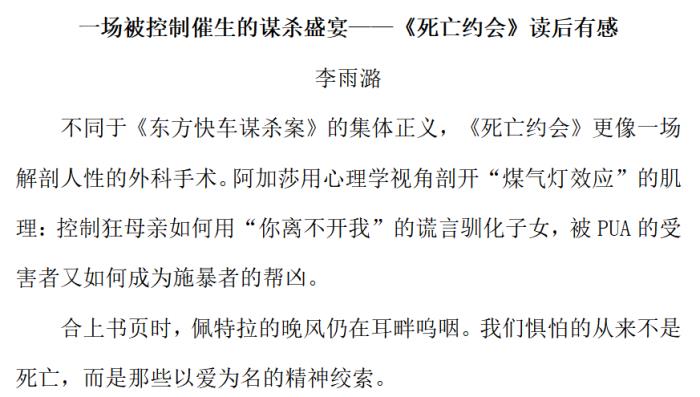 五部作品分别对应不同逻辑分析维度——从社会议题的逻辑解构到人性心理的推理剖析,引导学生在文本研读中,既感受推理文学的思辨价值,又主动运用课堂所学的逻辑分析方法解读情节,实现“理论知识→实践应用”的能力转化。