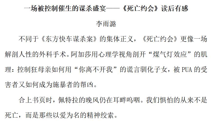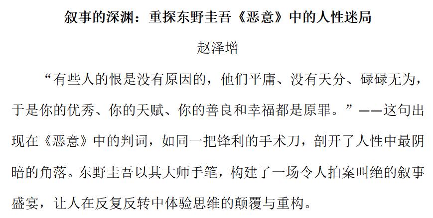 这些推理作品不仅是逻辑训练的有效载体,也引导学生关注人性、正义与社会议题。例如《长夜难明》中对正义的追寻、《恶意》中对复杂人性的揭示、《砂器》中个人与命运的纠葛等,均从不同维度拓展了学生的思维广度与认知深度。