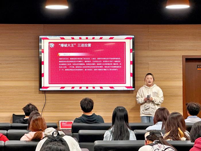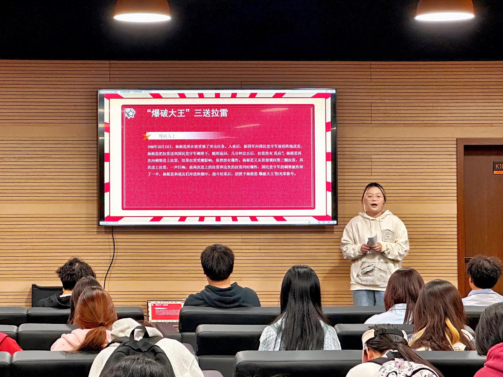 图书馆学生助理团队李佳怡同学通过视频资料《为了和平》节选,带领大家重温了杨根思烈士从新四军战士成长为抗美援朝特级英雄的光辉历程。当"三个不相信"的英雄誓言在会场回响时,在场同学无不为之动容。同时,李佳怡同学分享了《劳动最光荣》《英雄永驻》两本馆藏图书,引导同学们在阅读中深化对劳动价值和英雄精神的理解。