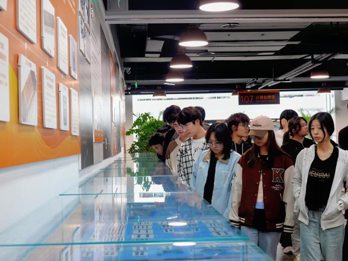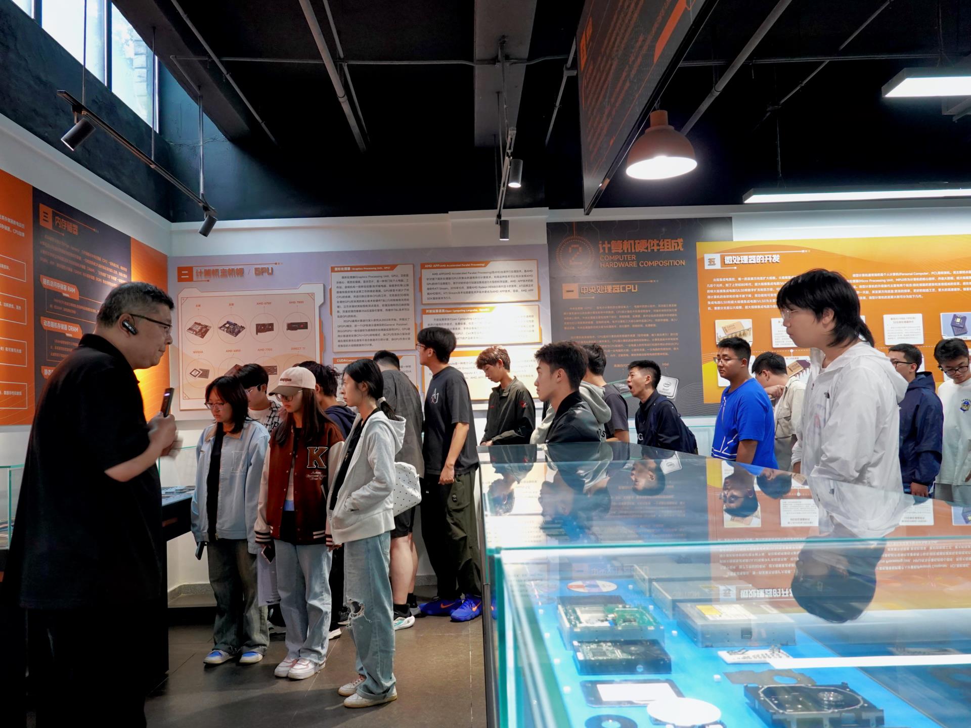 作为华天图书馆的特色馆舍,计算机特馆以其独特的“时间轴”设计,系统呈现了计算机技术的演进历程。从古老的计算尺到现代微处理器,丰富的实物展品与图文资料相得益彰,清晰勾勒出信息技术发展的脉络。从早期电子管计算机到当代高性能处理器,一系列具有里程碑意义的展品让同学们直观感受到科技革命的澎湃浪潮。巨馆长专业细致的讲解,进一步加深了同学们对学科历史的认知,激发了大家的创新意识与探索热情。