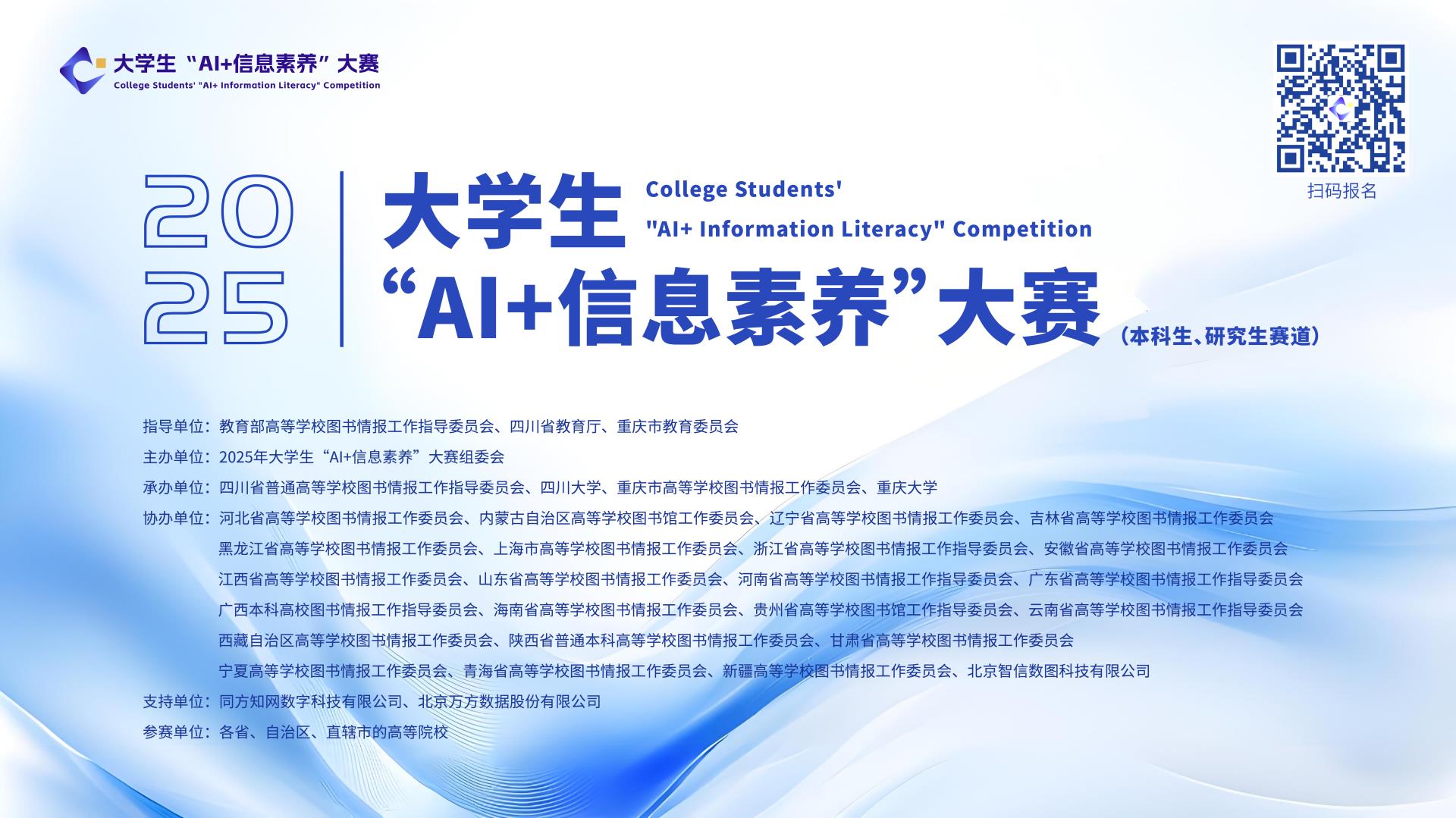 为深入贯彻落实党的二十大及二十届二中、三中全会精神,全面落实立德树人根本任务,在人工智能时代切实提升大学生信息素养,努力培养大学生创新精神和实践能力,经2025年大学生“AI+信息素养”大赛组织委员会研究决定,拟于2025年6-11月举办2025年大学生“AI+信息素养”大赛(以下简称“大赛”),协力打造多层次、高水平信息素养竞赛平台,提升人工智能时代大学生的信息素养。现将相关事项通知如下:
