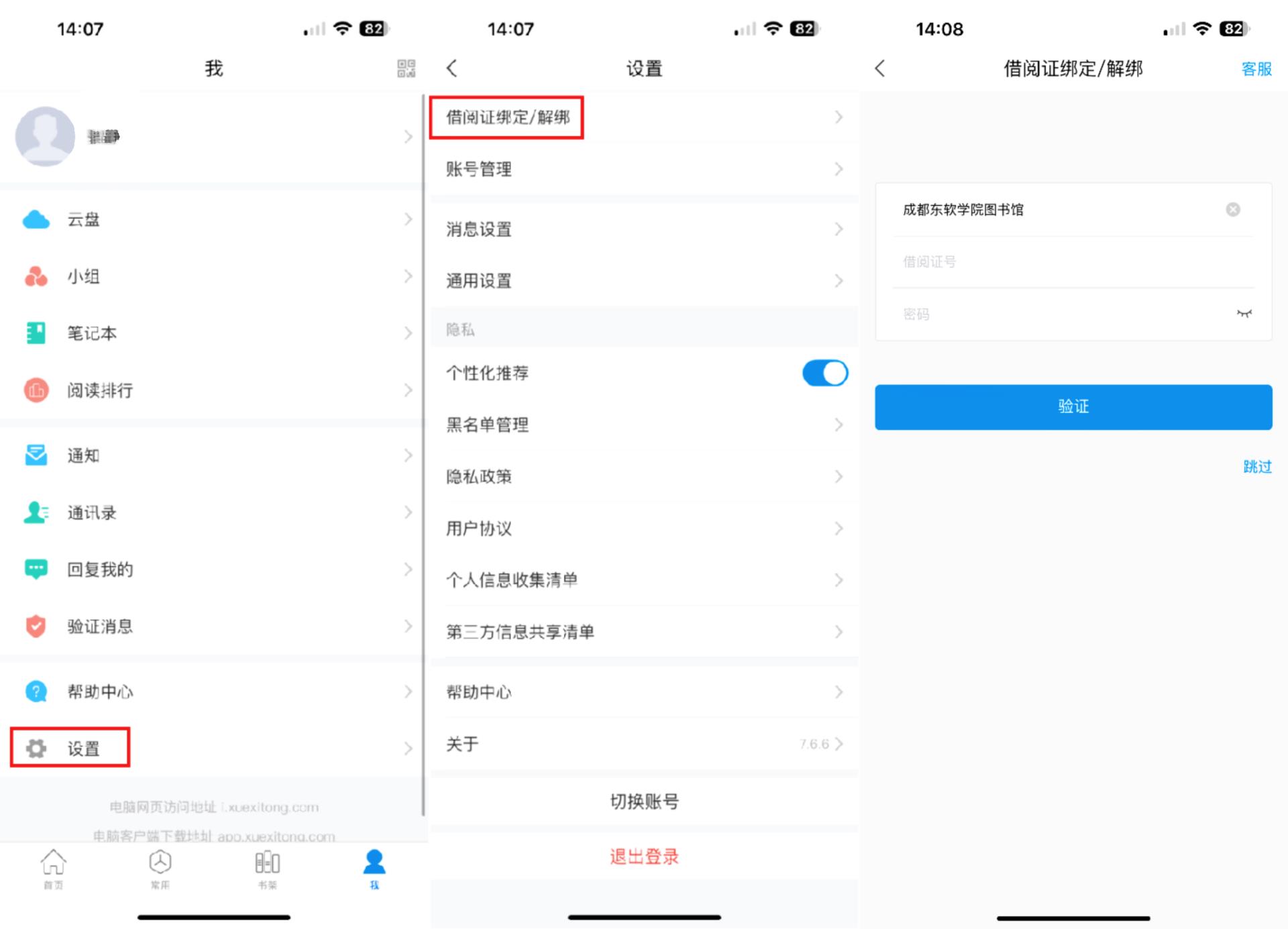 点击“设置”—“借阅证绑定/解绑”,输入单位名称:成都东软学院图书馆(点击选择下拉框中单位),输入借阅证号:
