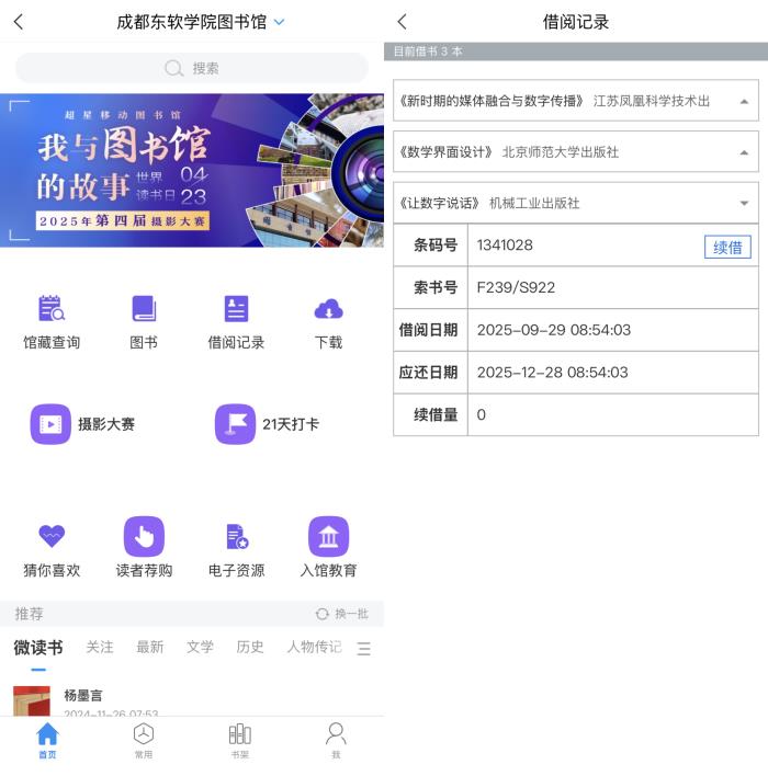 在成都东软学院图书馆界面馆藏服务板块可以使用借阅情况查询以及资源荐购等功能。欢迎各位读者体验!