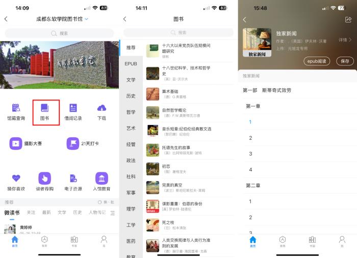 点击“图书”,进入“图书”模块。图书汇集了大量电子图书,分类全面,内容丰富。部分图书支持下载,离线阅读。