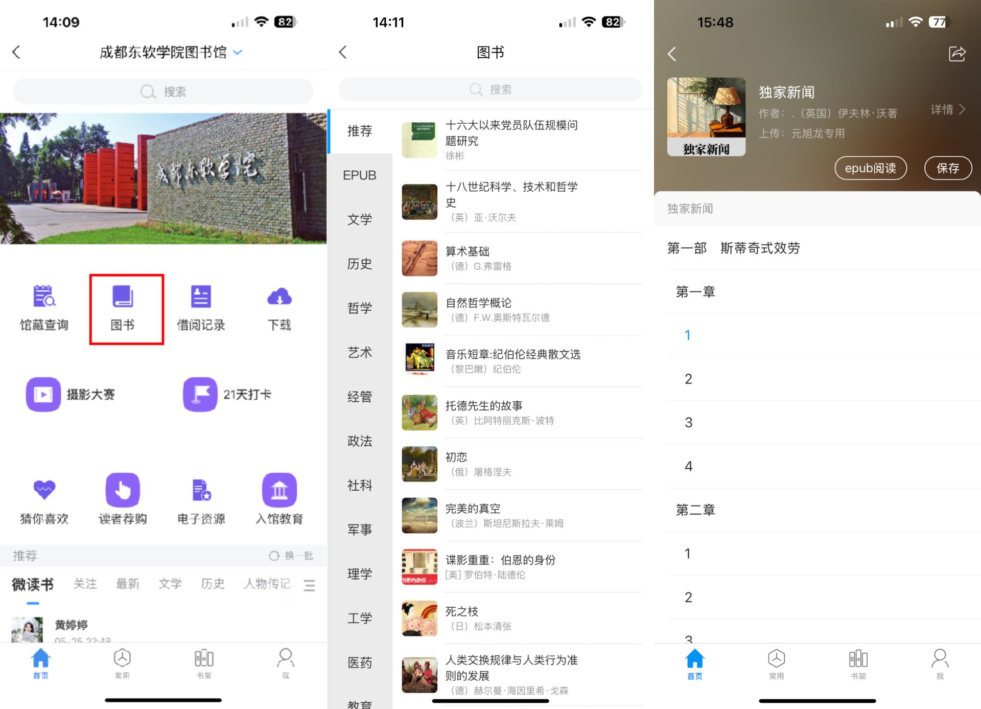 进入移动图书馆个人页面。点击顶部首页,进入成都东软学院图书馆界面。