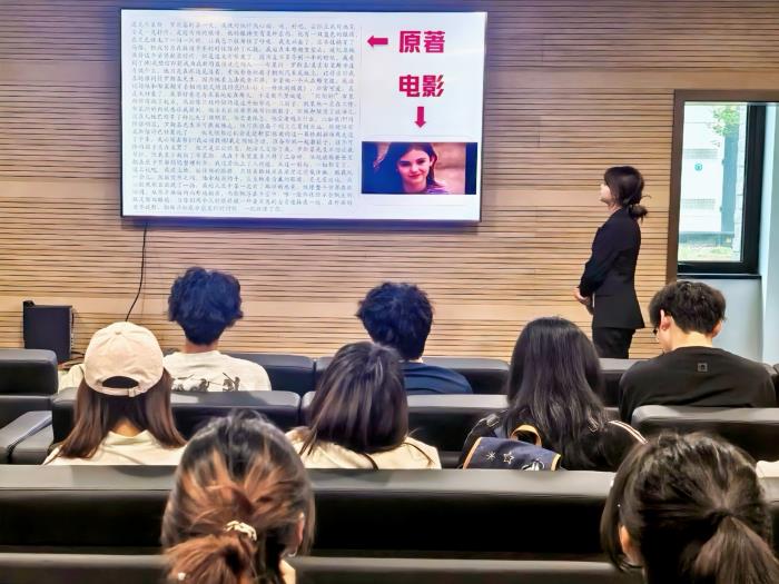 活动伊始,主持人范琴以"一本书是一个想象世界,一部电影是一首视觉诗篇"为引,阐释活动主旨。在原著赏析环节,同学们分段阅读了小说中男女主角初遇、家庭对话、鸡蛋事件等经典片段,细腻的文字让现场同学沉浸于主人公的情感波澜中。电影对比放映环节,导演罗伯・莱纳用独特的镜头语言,将梧桐树的挺拔坚韧、鸡蛋篮的微妙隐喻、夕阳下深情对话的浪漫场景一一呈现。电影中,鲜明的色彩搭配和动人的音乐,将朱莉的倔强个性烘托得淋漓尽致;而原著里大段的心理描写,则像一把钥匙,打开了读者通往朱莉孤独内心世界的大门,让人更能感同身受。两种艺术形式对相同情节的不同诠释,引发了同学们的思考。